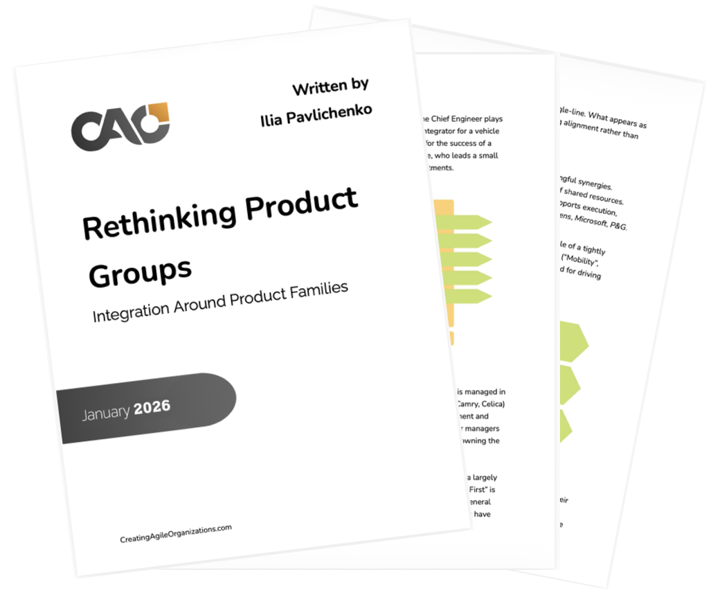 Covers agile transformation, systems thinking, organization design guides, team and group design, processes, product definition, and rewards alignment.
